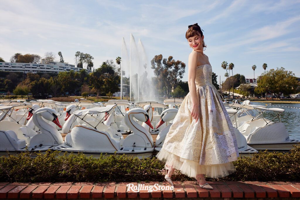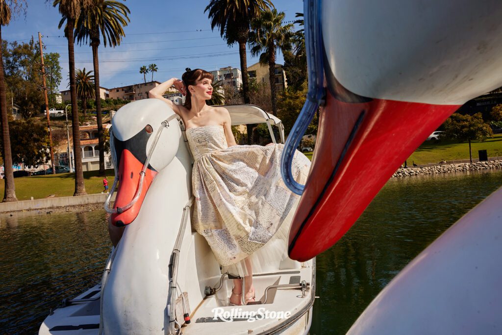 “Are my nipples out?” she asks, removing the puffy blue vest that, as she noted when we were suiting up for this aquatic adventure, doesn’t really go with her strapless Tanner Fletcher dress. It’s a gown in different off-white shades, made to look like pages of old letters and journal entries in flowing scripts, all stitched together — evoking the impassioned writings of a Jane Austen character, or pages of a novel-in-progress. Thankfully, nothing is out of place, and Mulvaney strikes one pose after another alongside the neck of our swan vessel, basking in the California sunshine. Only once does she nearly slip, quickly regaining her balance with a dancer’s poise. Close call.