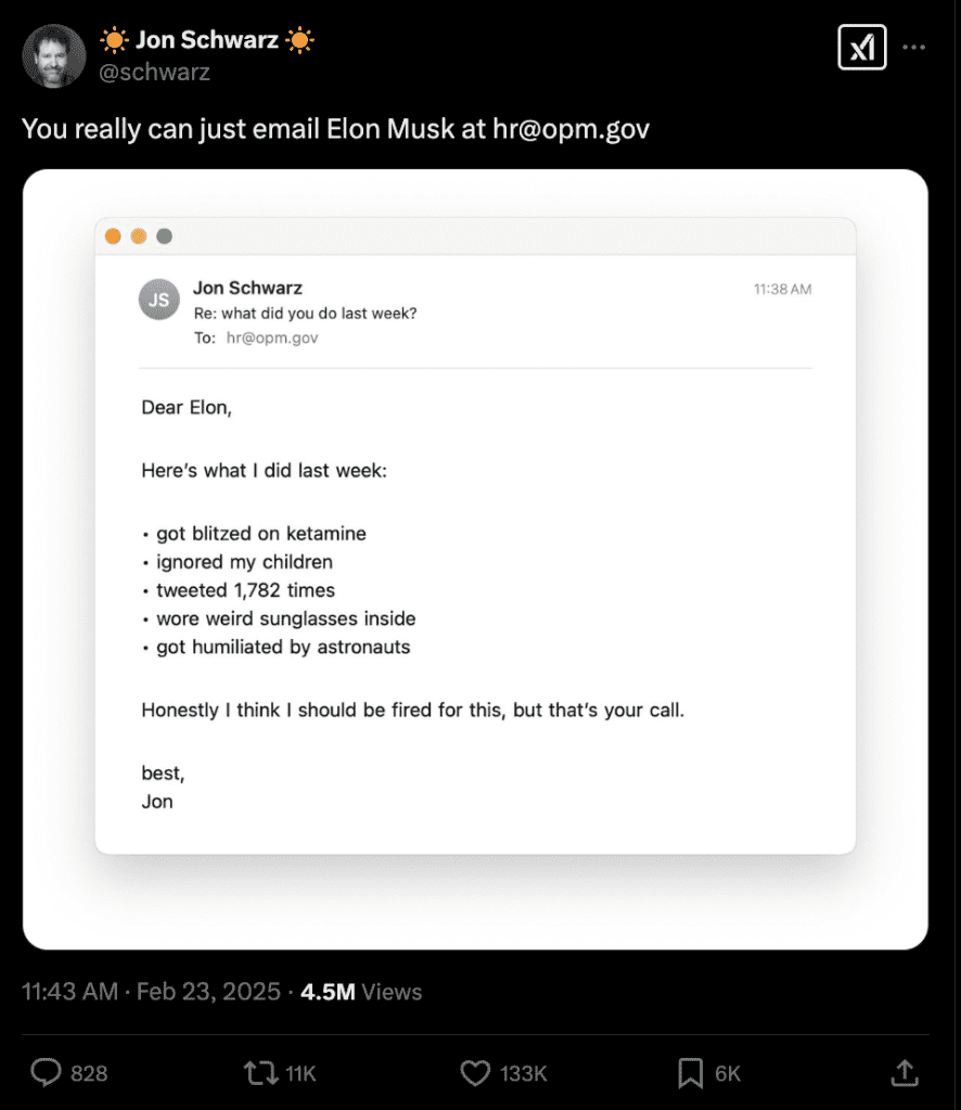 On Saturday afternoon, Musk tweeted that he would be requiring all federal employees to reply to an email with a rundown of their accomplishments for the week. “Consistent with President @realDonaldTrump’s instructions, all federal employees will shortly receive an email requesting to understand what they got done last week,” he wrote on X (formerly Twitter). “Failure to respond will be taken as a resignation.” The actual email that ended up in employees’ inboxes differed slightly, reading: “Please reply to this email with approx. 5 bullets of what you accomplished last week and cc: your manager. Please do not send any classified information, links, or attachments. Deadline is Monday at 11:59pmEST.”