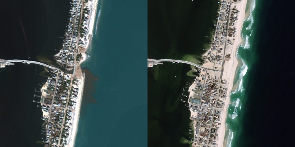 Satellite images of Mantoloking on Nov. 4, 2012 (left), and April 6, 2013 (right), after the beach was rebuilt