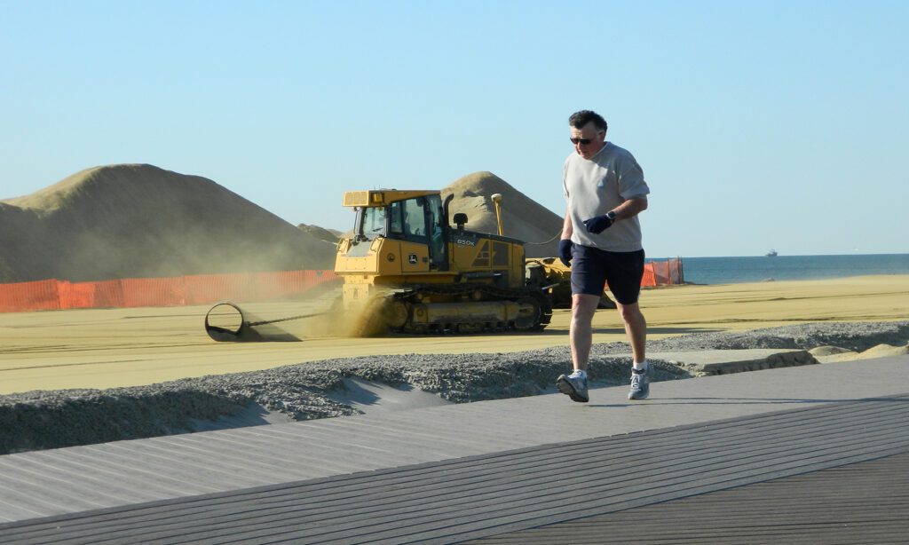 A man jogs past a beach replenishment project in Belmar, New Jersey, in April 2014.
