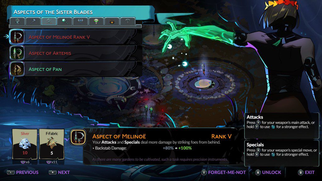The resource bit is where many players’ eyes might glaze over — there’s just so damned much to collect and spend. There’s bones, ashes, psyche, fate fabric, and moon dust that can all be spent on improving different gameplay systems with permanent upgrades. Then, there’s easily a dozen or more items like plants, minerals, and literal trash that can be found on runs, mined from beating bosses, or farmed in the Crossroads. Then, there’s exotic goods, which are little gifts which must be selectively (and repeatedly) offered to all the supporting cast individually to forge relationships (and even romance a few).