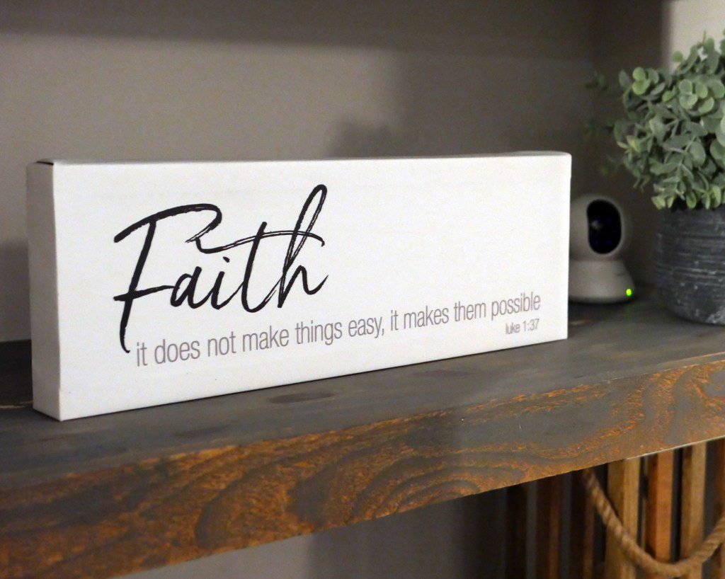 A decorative pep talk on the Corbitts’ bookshelf
