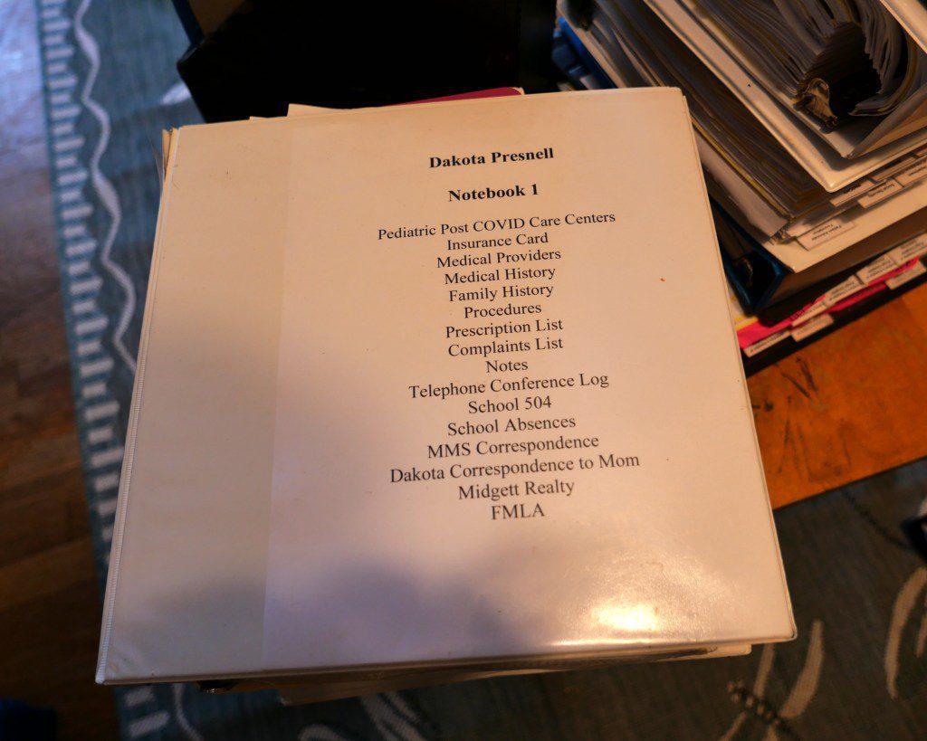 A table of contents for one of many notebooks maintained by Dakota’s mom, Michelle, charting his medical care and correspondence with the school district.