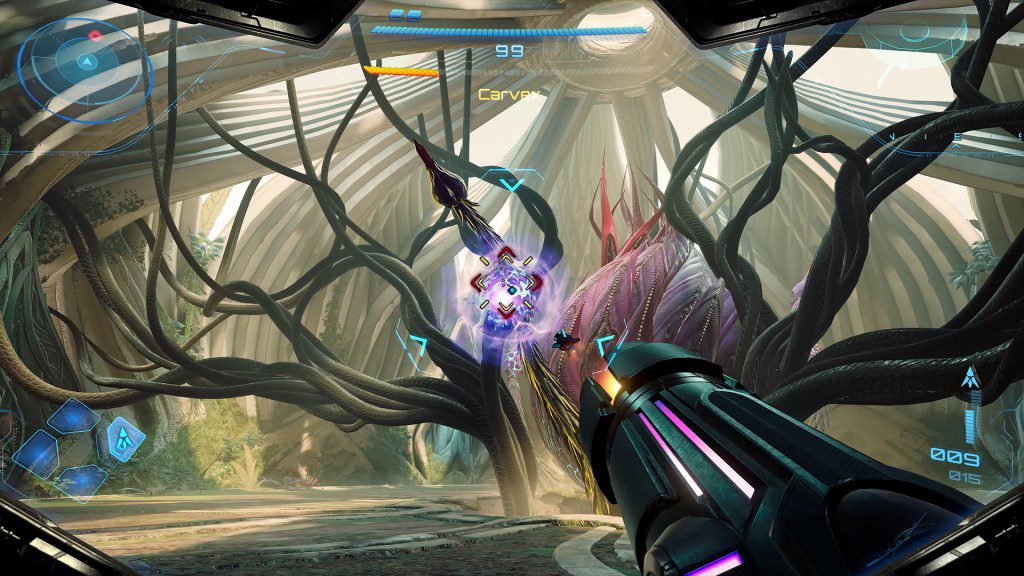 Visually, the game looks nice — with sprawling vistas in the distance when looking beyond the edge of the cliffs and little particle effects filling the air. There’s some great lighting, too, with bloom effects and glints of sunbeams peering through Samus’ visor, as well as the return of the occasional reflection of her face in the helmet’s glass (a detail that blew fans’ collective minds back in 2002).