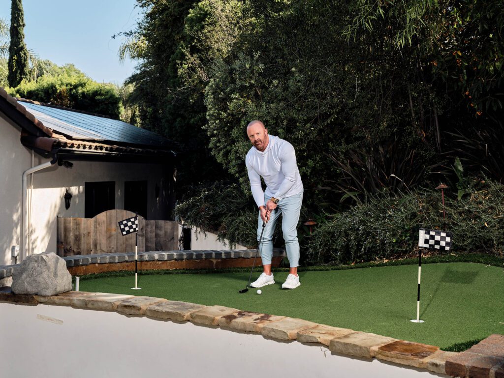Bowyer putts in his Orange County backyard while awaiting sentencing.