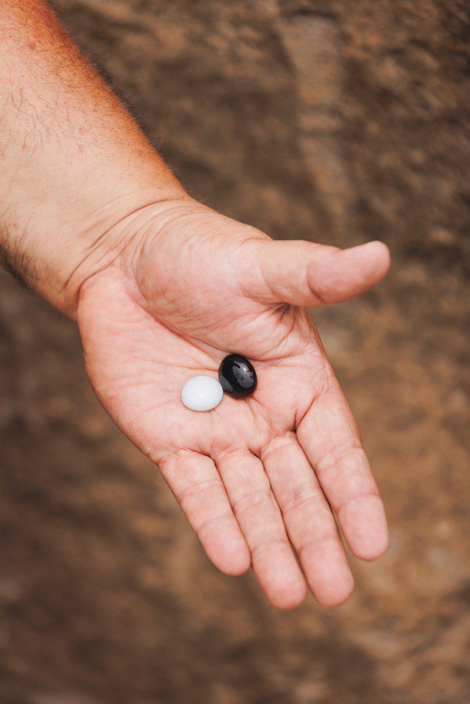 “You have to choose,” he said. Then he held out his hands, fists closed, over the fishpond as if he was starting a Kōnane game. “Black or white.”