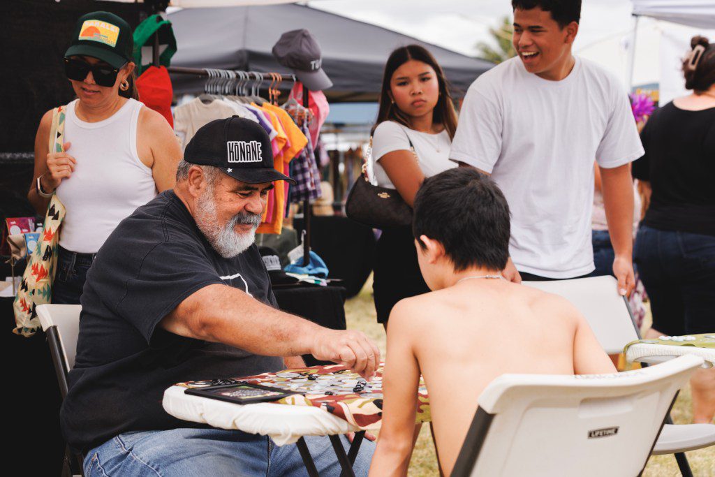 John Kaʻohelauliʻi teaching a young boy how to play Kōnane at the Polynesian festival in Kaua`i, Hawaii on Aug. 2, 2025.