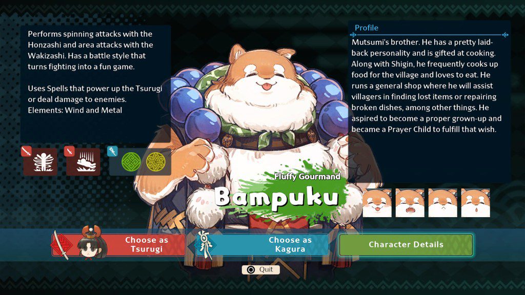 Each of the guardians (and Towa herself) are all designed to play somewhat differently. Some, like the samurai-esque warrior Rekka, are nimble with sword slice. Others, like the adorably chunky furball Bampuku, are slower and meant to soak up more damage. The cast are all cutely designed, with gorgeously illustrated portraits that appear in menus and conversations. In-game, however their 3D models do less to express their personalities.