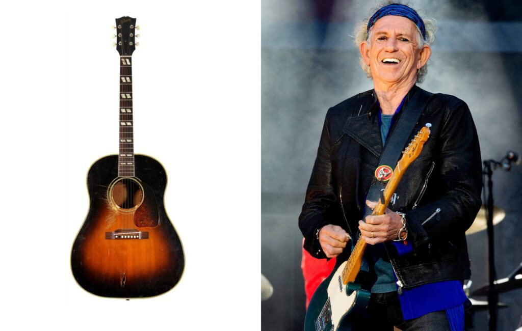 The legendary Rolling Stones guitarist reportedly blew a hole in the Gibson 1952 SJ Southern Jumbo Sunburst Acoustic Guitar after an argument with Ronnie Wood in 1995.