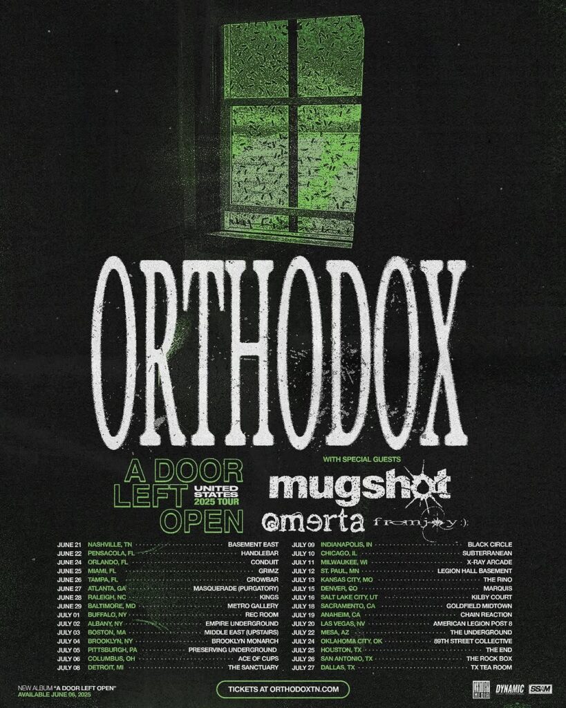 Nashville metalcore band Orthodox will support their upcoming album A Door Left Open on a summer tour with Mugshot, Omerta, and fromjoy. The NYC show at Brooklyn Monarch on July 4, “Red, White, and Bruise: A July 4th Beatdown Extravaganza,” has more bands still to be added.