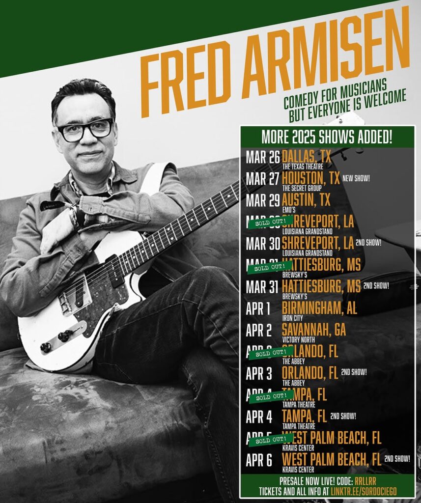 Fred Armisen will be out this spring on his “Comedy for Musicians but Everyone Is Welcome” tour, with stops in Dallas, Houston, Austin, Shreveport, Hattiesburg, Birmingham, Savannah, Orlando, Tampa, and Palm Beach.