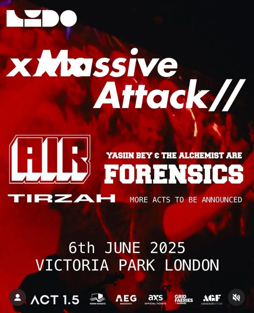 Massive Attack will play London’s Victoria Park on June 6 as part of the Lido Festival series. The show will be the first London headliner festival set to be 100% powered by battery, as part of the group’s work with Act 1.5 to help decarbonise live music events. The day also features sets from AIR, Yasiin Bey and The Alchemist as FORENSICS, and Tirzah. The Lido series also features performances by Jamie xx (June 7), Charli XCX (June 14), London Grammar (June 15) and more.