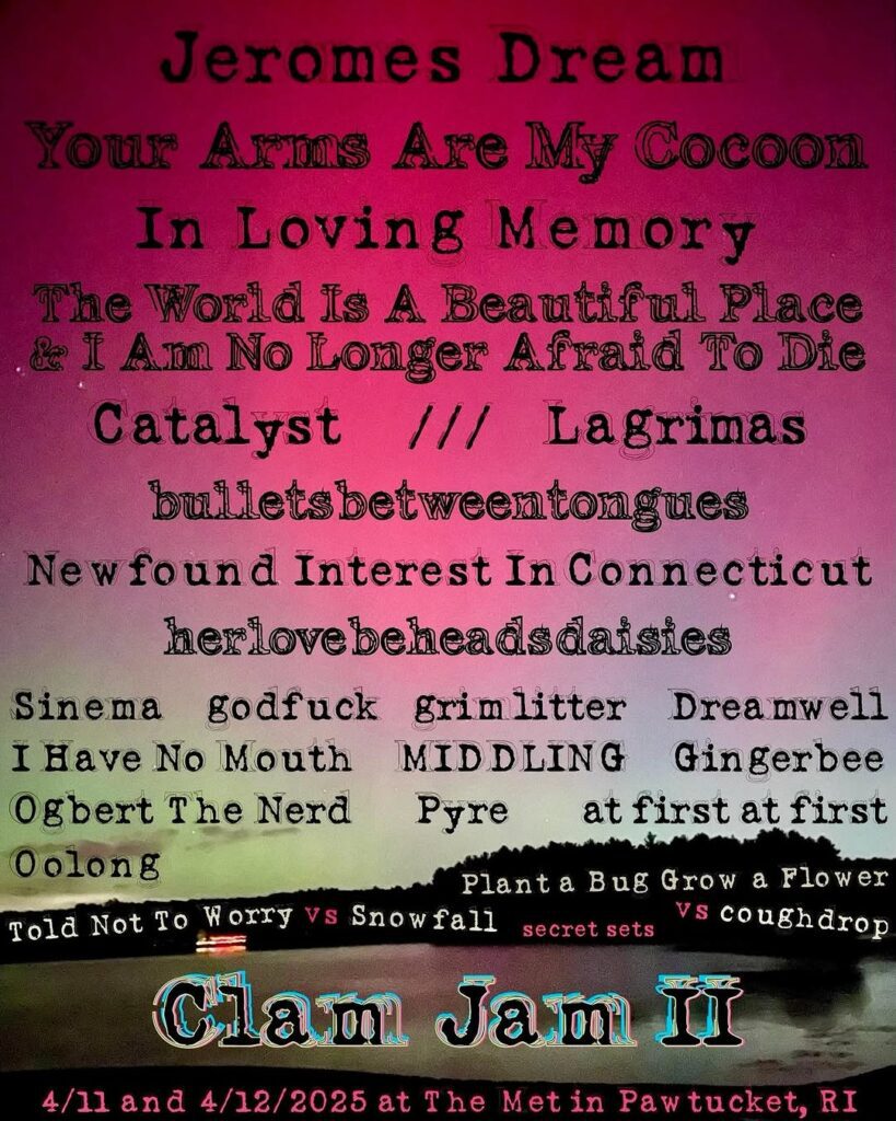 Providence, RI screamo/emo festival Clam Jam goes down April 11-12 and it just added two more bands, The World is a Beautiful Place & I am No Longer Afraid to Die and Gingerbee, who join a mix of newer bands and reunited older ones, like Jeromes Dream, Your Arms Are My Cocoon, In Loving Memory, Catalyst, Lagrimas, bulletsbetweentongues, Newfound Interest In Connecticut, herlovebeheadsdaisies, Dreamwell, Ogbert the Nerd, Pyre, Oolong, and more. Tickets here.